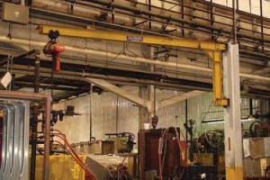 Wall Cantilever Jib Cranes provide hoist coverage and 200° rotation for individual use in bays, along walls, or columns of plants, or as a supplement to an overhead crane or monorail system. Wall cantilever jib cranes provide maximum lift for the hoist, because they can be installed very close to the underside of the lowest ceiling obstruction.